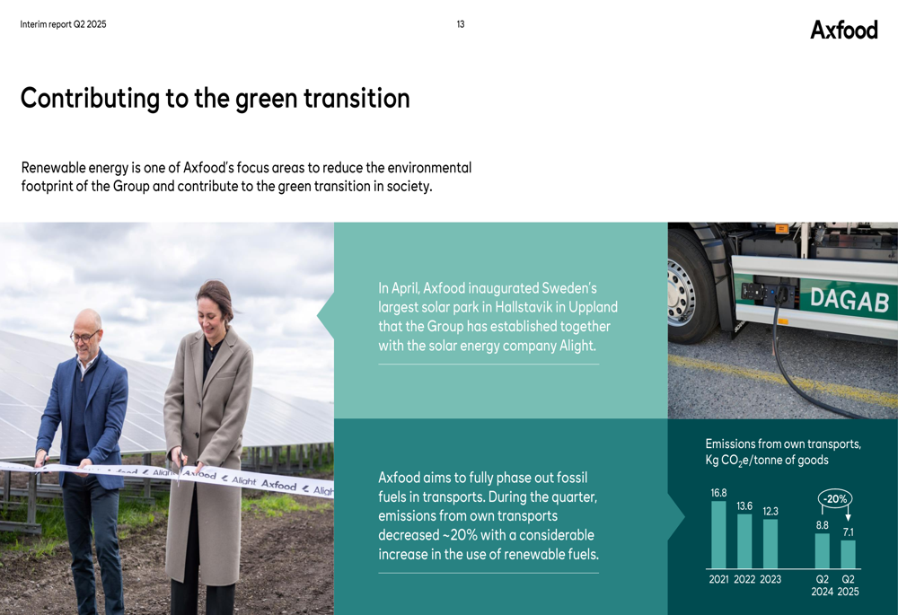 A Axfood continuou a avançar em sua agenda de sustentabilidade durante o trimestre, com foco particular em energia renovável. A empresa inaugurou o maior parque solar da Suécia em Hallstavik, marcando um marco significativo em seus esforços de transição verde.