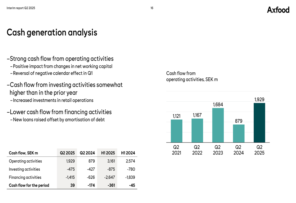 A Axfood reportou forte fluxo de caixa das atividades operacionais, atingindo SEK 1.929 milhões no 2º tri de 2025: