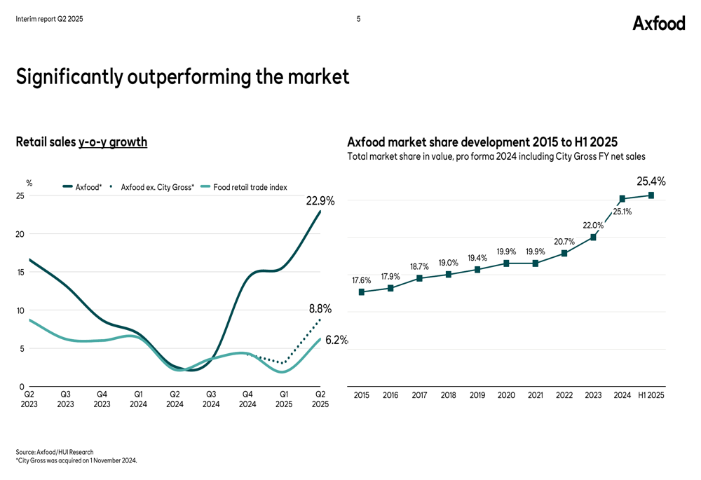 Como mostrado no gráfico a seguir sobre o desenvolvimento da participação de mercado, a Axfood aumentou constantemente sua posição no mercado sueco de alimentos, atingindo 25,4% no primeiro semestre de 2025, em comparação com apenas 17,6% há uma década: