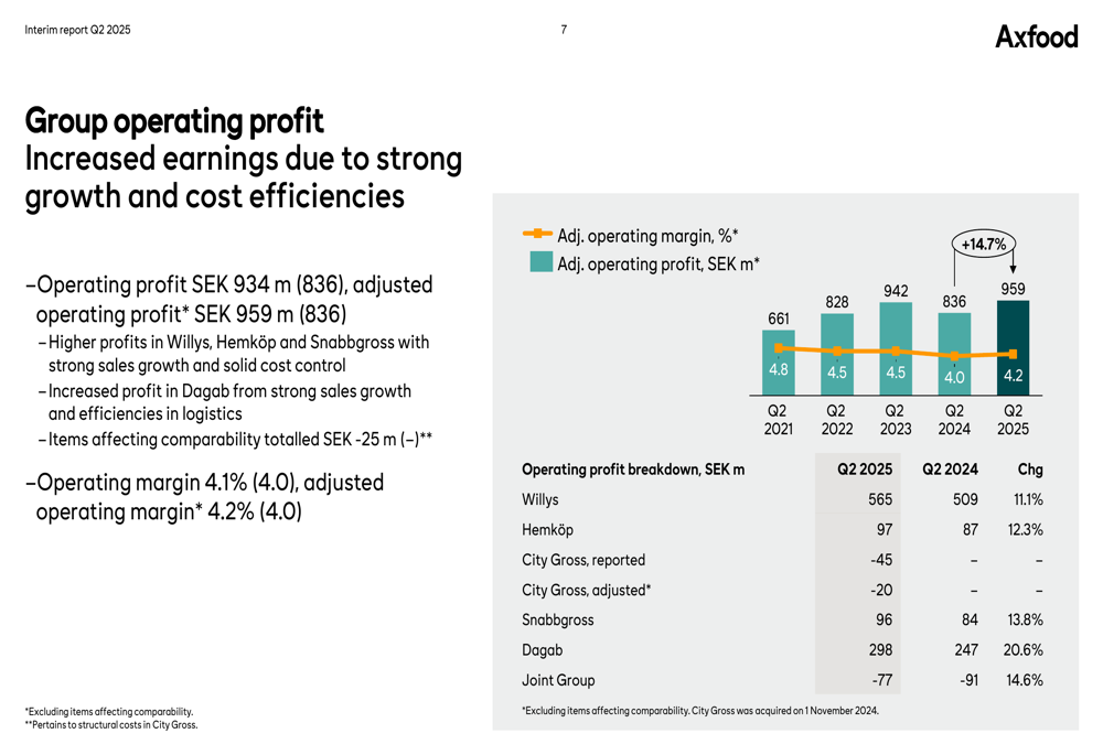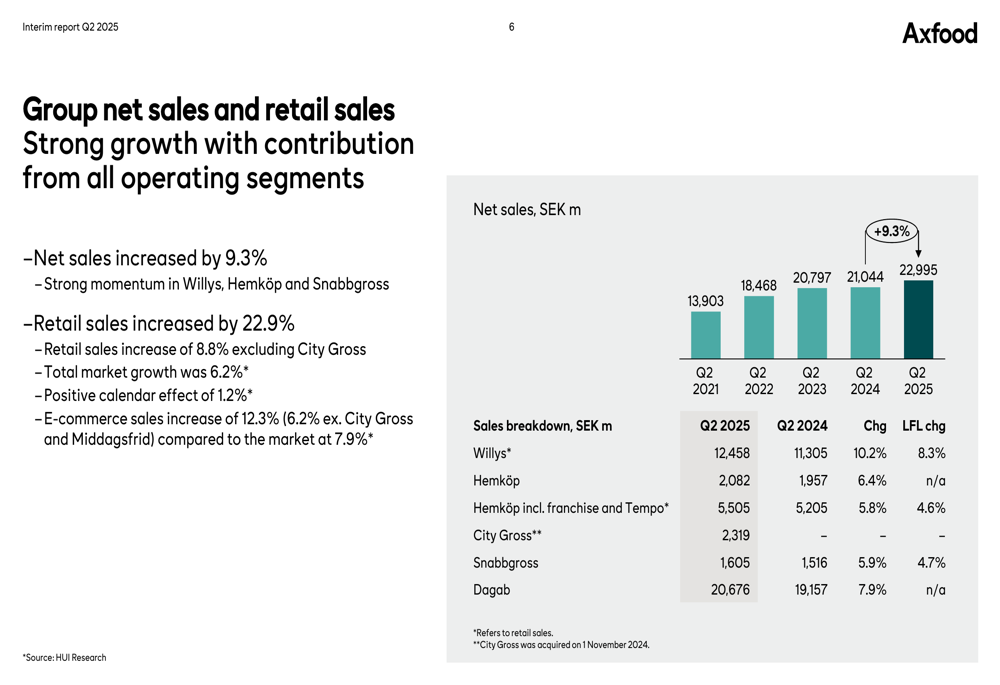 Snabbgross, o negócio atacadista da Axfood, entregou "forte desempenho em um mercado fraco" com vendas líquidas aumentando 5,9% e vendas comparáveis subindo 4,7%. O lucro operacional subiu para SEK 96 milhões (84 milhões), com margem operacional melhorando para 6,0% (5,5%).