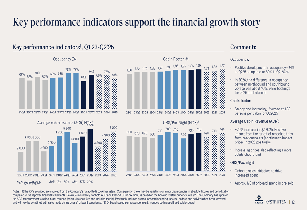 Como mostrado no gráfico de destaques de negócios a seguir, a empresa alcançou 74% de ocupação no 2º tri 2025, acima dos 69% no mesmo período do ano passado, enquanto a Receita Média por Cabine (ACR) aumentou para NOK 5.630 em comparação com NOK 4.700 no 2º tri 2024: