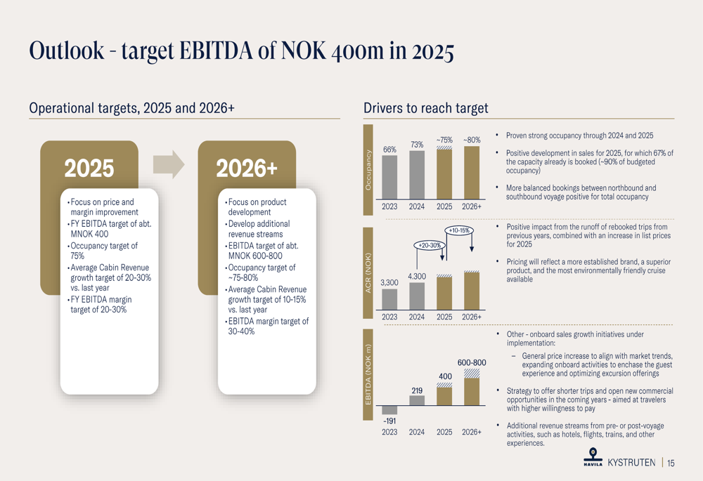 Para 2026 e além, a Havila Kystruten planeja focar no desenvolvimento de produtos e fluxos de receita adicionais, visando um EBITDA de MNOK 600-800, ocupação de 75-80% e uma margem EBITDA de 30-40%: