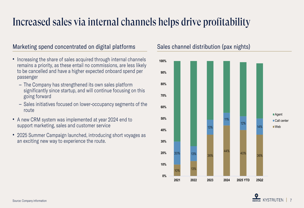 A Havila Kystruten tem se concentrado em aumentar as vendas por canais internos para melhorar a lucratividade. A empresa implementou um novo sistema de CRM no final de 2024 e lançou uma Campanha de Verão 2025, introduzindo viagens curtas como uma nova maneira de experimentar a rota costeira.