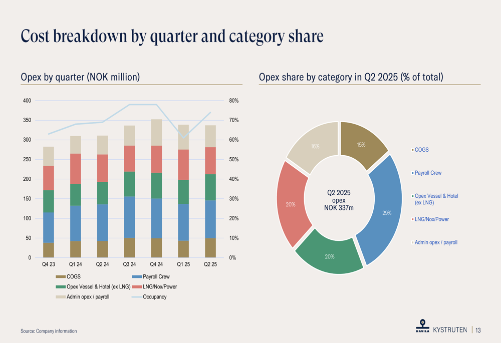 A gestão de custos continua sendo uma área de foco para a empresa. No 2º tri 2025, os custos operacionais aumentaram para MNOK 337 devido ao crescimento da atividade e à inflação geral. A análise de custos mostra que a folha de pagamento da tripulação representa a maior categoria de despesas, com 29% do total de custos, seguida pelas operações de navios e hotelaria (excluindo GNL) com 20% e custos administrativos com 20%: