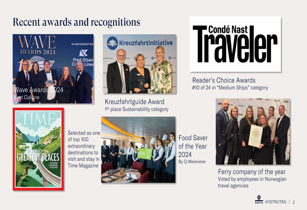 A Havila Kystruten recebeu numerosos prêmios e reconhecimentos que melhoram seu posicionamento no mercado, incluindo Melhor Culinária no Wave Awards 2024, primeiro lugar na categoria Sustentabilidade no Kreuzfahrtguide Award e seleção como um dos 100 destinos extraordinários pela revista TIME: