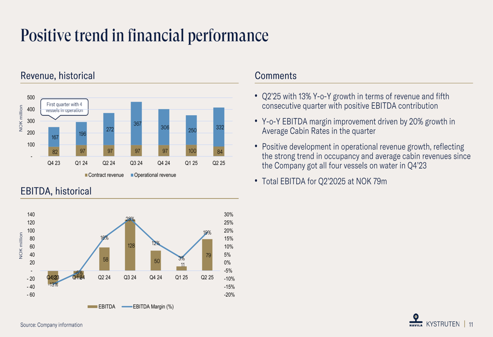A Havila Kystruten reportou uma receita operacional de MNOK 332 no 2º tri 2025, representando um aumento de 22% em comparação ao mesmo período do ano passado. O EBITDA alcançou MNOK 79, um aumento de 35% em relação aos MNOK 58 do 2º tri 2024, demonstrando melhoria significativa na lucratividade.