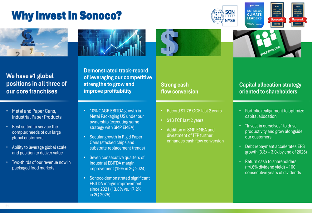 A empresa enfatizou seus pontos fortes competitivos como oportunidade de investimento, observando suas posições globais de nº 1 em todas as três franquias principais: Latas Metálicas e de Papel, e Produtos de Papel Industrial. A Sonoco demonstrou um histórico de aproveitamento dessas vantagens competitivas para crescer e melhorar a rentabilidade, com um CAGR de 10% no crescimento do EBITDA em Embalagens Metálicas e melhoria significativa na margem EBITDA desde 2021 (de 13,8% para 17,2% no 2º tri 2025).
