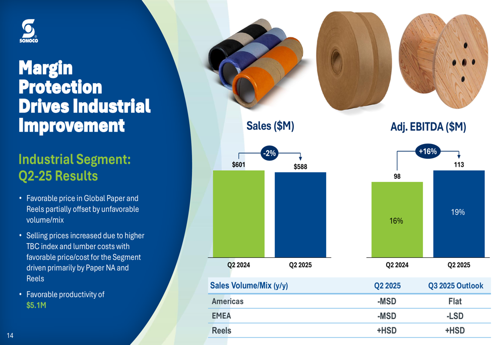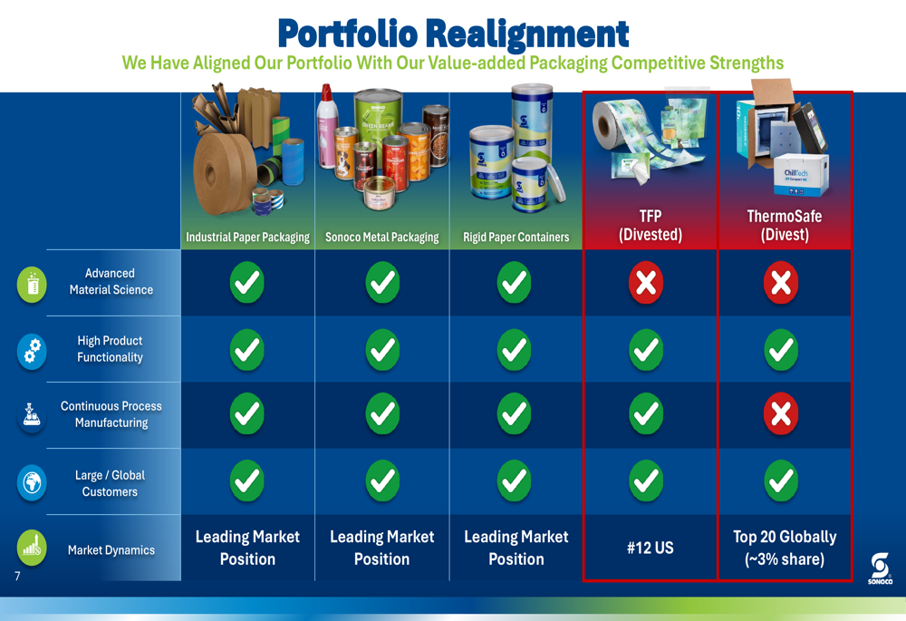 A Sonoco tem remodelado ativamente seu portfólio para alinhar-se com seus principais pontos fortes em embalagens de valor agregado. A empresa desinvestiu seu negócio de Embalagens Termoformadas e Flexíveis (TFP) e está preparando a ThermoSafe para desinvestimento no segundo semestre de 2025.