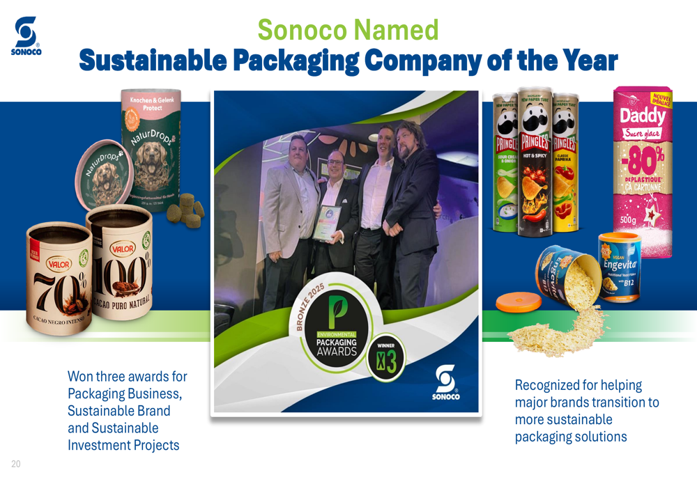A Sonoco se posicionou como líder em embalagens sustentáveis, sendo recentemente nomeada "Empresa de Embalagens Sustentáveis do Ano". A empresa ganhou três prêmios por seu negócio de embalagens, marca sustentável e projetos de investimento sustentável, refletindo seu compromisso em ajudar grandes marcas na transição para soluções de embalagem mais ecológicas.