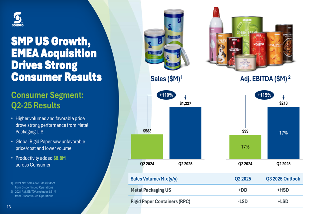 No segmento de consumo, a SMP US está projetando crescimento de 12% em latas de alimentos e 15% em aerossóis em 2025, enquanto o negócio de Recipientes Rígidos de Papel está lançando novas latas totalmente de papel e com fundo de papel para substituir embalagens plásticas na Europa.