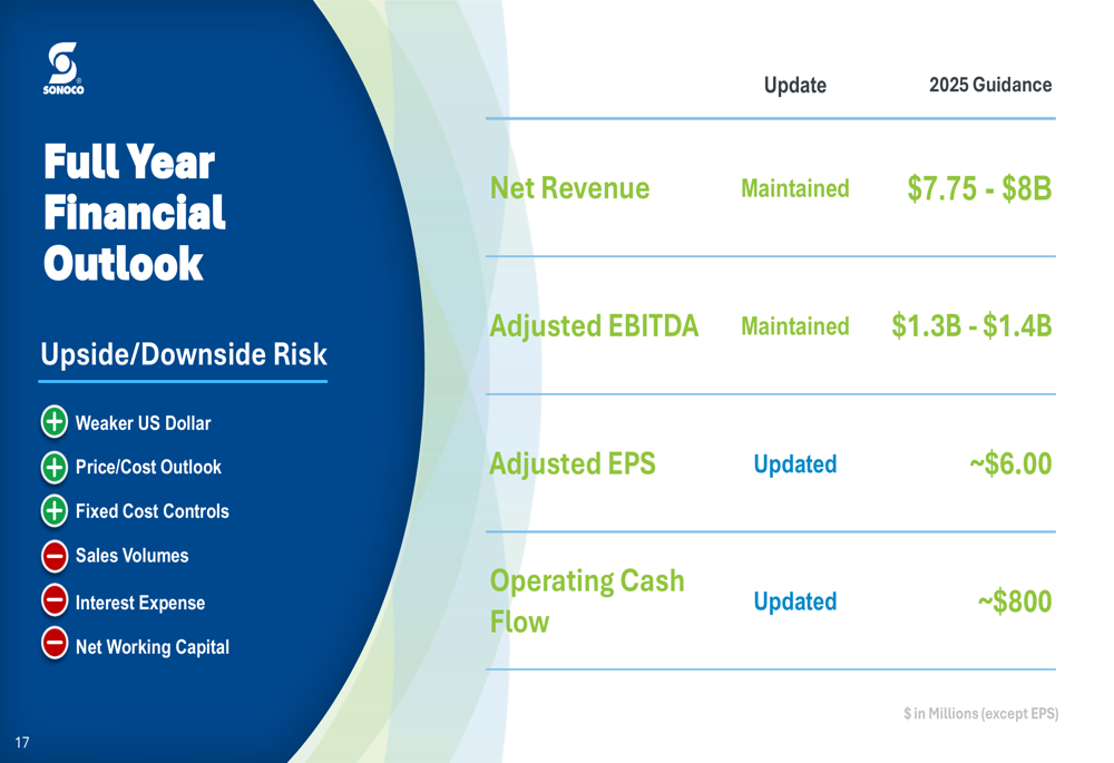 Para o ano completo de 2025, a Sonoco manteve sua orientação de receita líquida de US$ 7,75-8 bilhões e previsão de EBITDA ajustado de US$ 1,3-1,4 bilhões. A empresa atualizou sua perspectiva de LPA ajustado para aproximadamente US$ 6,00 e fluxo de caixa operacional para aproximadamente US$ 800 milhões.