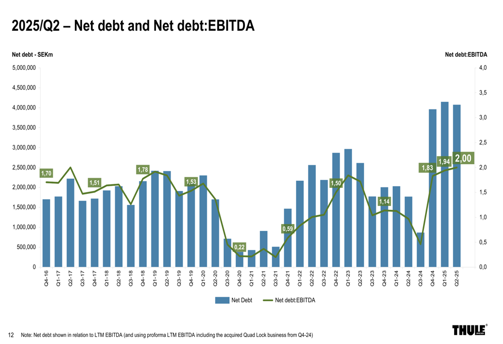 O fluxo de caixa operacional atingiu SEK 774 milhões, abaixo dos SEK 879 milhões no mesmo período do ano passado, com a empresa observando que o capital de giro está retornando aos padrões sazonais históricos. A relação dívida líquida/EBITDA da Thule aumentou para 2,00 no 2º tri 2025, acima de 1,83 no trimestre anterior.