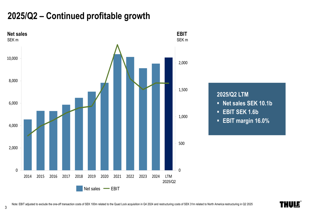 O desempenho da Thule variou significativamente entre as categorias de produtos. Sport & Cargo Carriers, o negócio principal da empresa, registrou crescimento de 3% no 2º tri e 1% no acumulado do ano, impulsionado por novos produtos como o atualizado suporte para bicicletas Thule Easyfold 3 e o leve Thule Outpace. A empresa destacou um desempenho particularmente forte na Europa, compensando a contínua fraqueza na América do Norte.