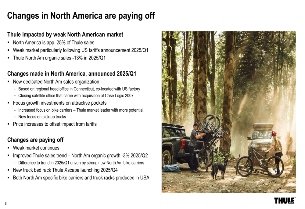 A América do Norte representa aproximadamente 25% das vendas da Thule, e a empresa implementou várias iniciativas para enfrentar os desafios neste mercado, incluindo: