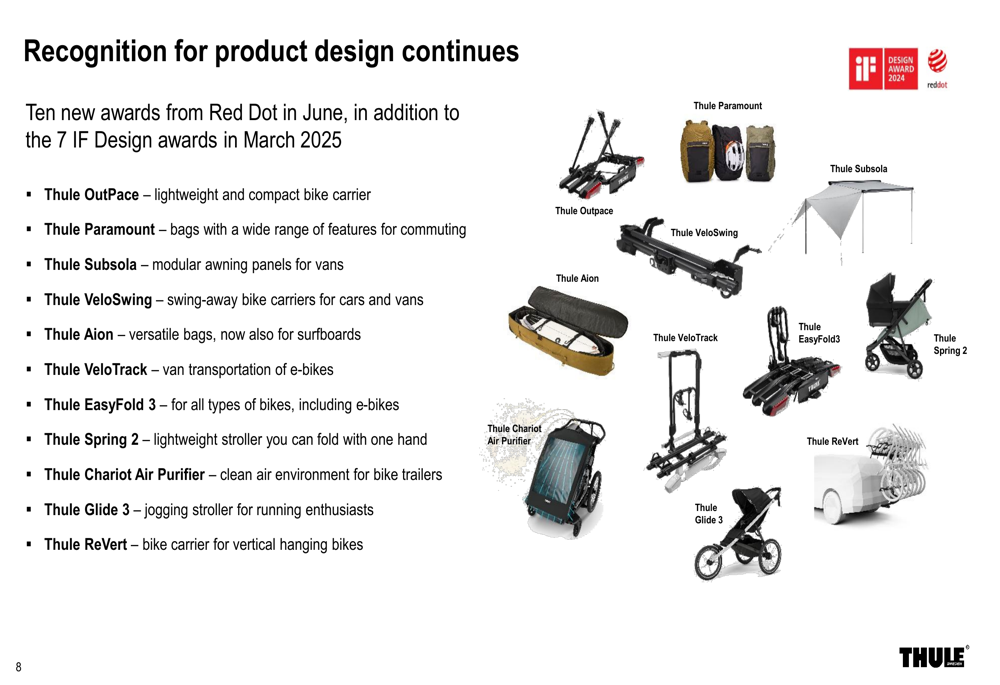A Thule enfatizou seu contínuo investimento em desenvolvimento de produtos, com a empresa recebendo dez novos prêmios de design Red Dot em junho de 2025, após sete prêmios IF Design em março. Esses reconhecimentos abrangeram múltiplas categorias de produtos, reforçando o posicionamento premium da empresa.