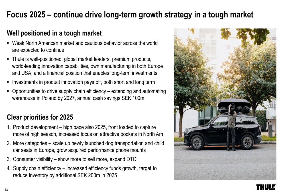 Olhando para o futuro, a Thule reconheceu que as condições fracas de mercado na América do Norte e o comportamento cauteloso dos consumidores em todo o mundo devem continuar. No entanto, a empresa expressou confiança em seu posicionamento, citando sua liderança global de mercado, produtos premium, capacidades de inovação e força financeira.