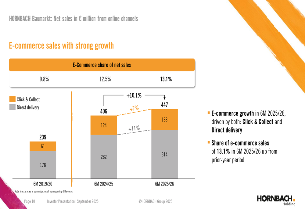 O e-commerce continua sendo um importante impulsionador de crescimento para a HORNBACH, com vendas online atingindo €447 milhões no primeiro semestre de 2025/26, representando 13,1% do total de vendas líquidas. Isso marca um aumento em relação aos 12,5% do ano anterior, com serviços de entrega direta e clique e retire contribuindo para esse crescimento.