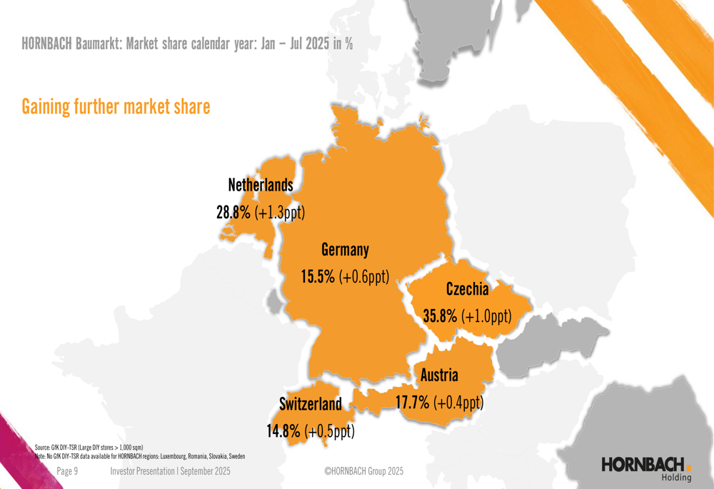 A HORNBACH expandiu com sucesso sua participação de mercado em regiões-chave durante o ano calendário de 2025. Particularmente notáveis são os ganhos nos Países Baixos (+1,3 pontos percentuais para 28,8%) e na Alemanha (+0,6 pontos percentuais para 15,5%). A classificação #1 da empresa em satisfação do cliente na Alemanha e na Áustria ressalta ainda mais sua força competitiva.