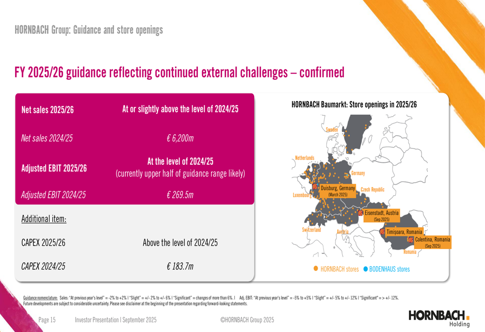 A HORNBACH manteve sua orientação para o ano fiscal 2025/26, esperando que as vendas líquidas estejam no mesmo nível ou ligeiramente acima do nível do ano anterior de €6.200 milhões. A empresa prevê que o EBIT ajustado esteja no nível de 2024/25 (€269,5 milhões), com o desempenho atual sugerindo que os resultados provavelmente estarão na metade superior da faixa de orientação.