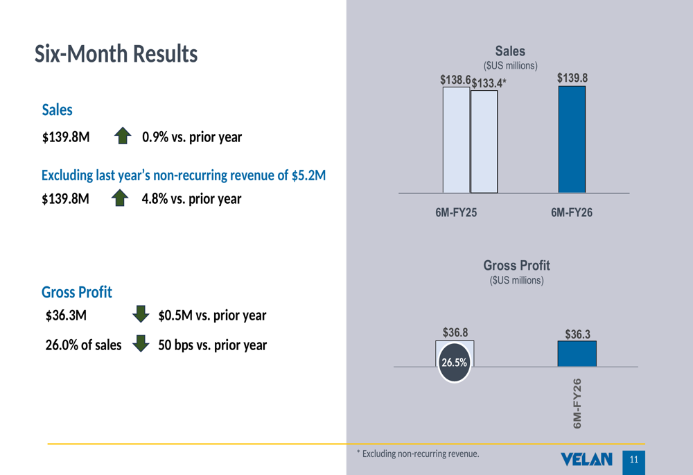 Para o período de seis meses, os resultados foram mais estáveis, com vendas de US$ 139,8 milhões representando um aumento de 0,9% ano a ano (4,8% excluindo a receita não recorrente do ano passado). O lucro bruto para o semestre foi de US$ 36,3 milhões, uma leve diminuição de US$ 0,5 milhão em relação ao ano anterior.