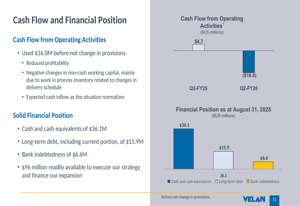 Apesar dos desafios de desempenho trimestral, a Velan mantém uma base financeira sólida com US$ 36,1 milhões em caixa e equivalentes, dívida de longo prazo de US$ 15,9 milhões e endividamento bancário de US$ 6,6 milhões. A empresa relata ter US$ 96 milhões prontamente disponíveis para executar sua estratégia e financiar expansão.