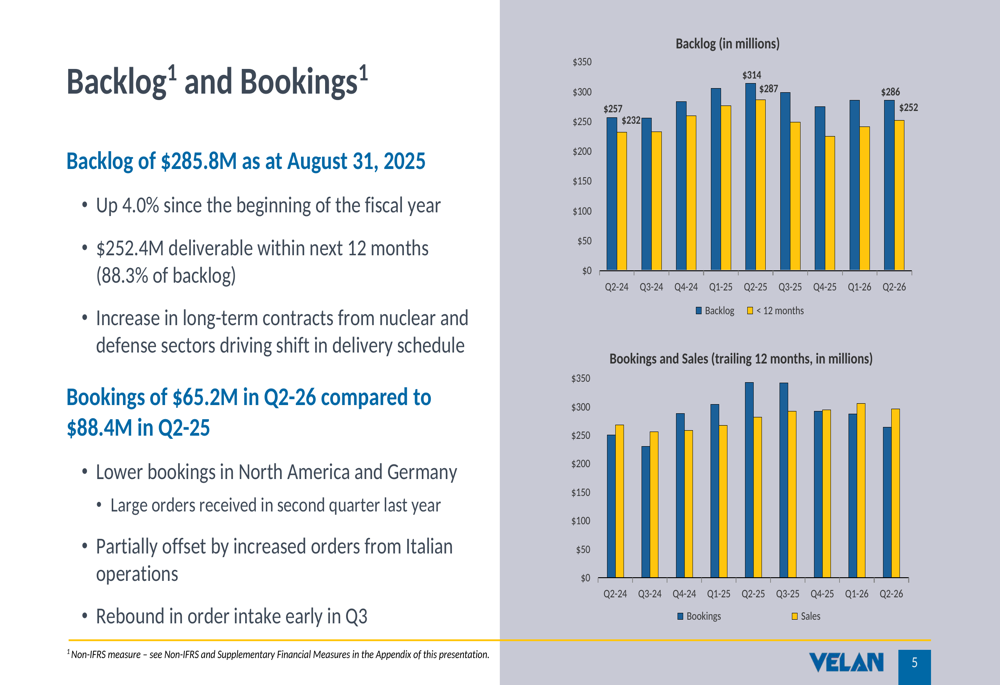 A Velan reportou vendas de US$ 67,6 milhões no 2º tri-FY2026, uma queda de 13,0% em comparação ao ano anterior. Excluindo a receita não recorrente de US$ 5,2 milhões do ano passado, as vendas diminuíram 6,7%. A empresa atribuiu essa diminuição principalmente a entregas reprogramadas e interrupções tarifárias que afetaram decisões de compra.