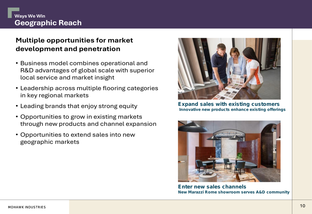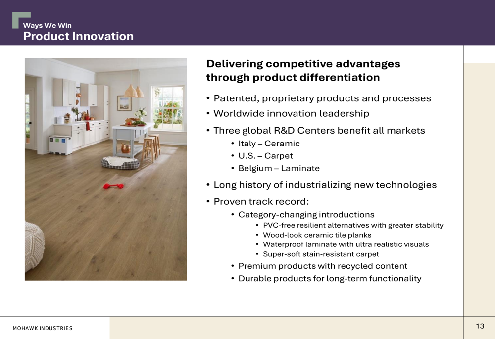 A Mohawk continua focada na excelência operacional, com ações de reestruturação que devem proporcionar aproximadamente US$ 100 milhões em economias para 2025. A empresa está otimizando processos de fabricação, simplificando ofertas de produtos e aproveitando tecnologia avançada para aumentar a produtividade.