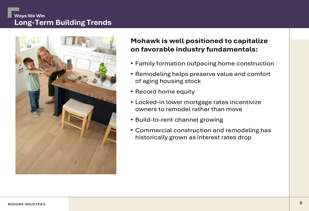 Enquanto a Mohawk navega pelo ambiente atual de mercado, seu foco em excelência operacional, inovação de produtos e disciplina financeira proporciona uma base para desempenho sustentável e posiciona a empresa para capitalizar a recuperação do mercado quando esta ocorrer.
