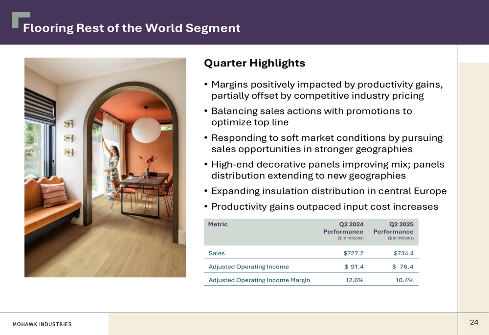O segmento Flooring Rest of the World (Revestimentos Resto do Mundo) viu um modesto aumento nas vendas para US$ 734,4 milhões, embora as margens operacionais tenham caído de 12,6% para 10,4%. Este segmento foi positivamente impactado por ganhos de produtividade enquanto a empresa equilibrava ações de vendas para otimizar a receita em condições de mercado fracas:
