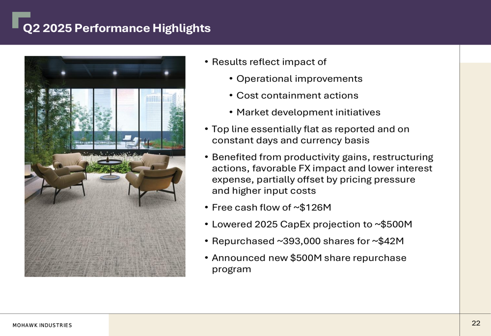 Os resultados do 2º tri de 2025 da Mohawk demonstraram a capacidade da empresa de manter o desempenho apesar dos desafios do mercado. A empresa gerou US$ 126 milhões em fluxo de caixa livre durante o trimestre e anunciou um novo programa de recompra de ações de US$ 500 milhões após recomprar aproximadamente 393.000 ações por US$ 42 milhões no trimestre.