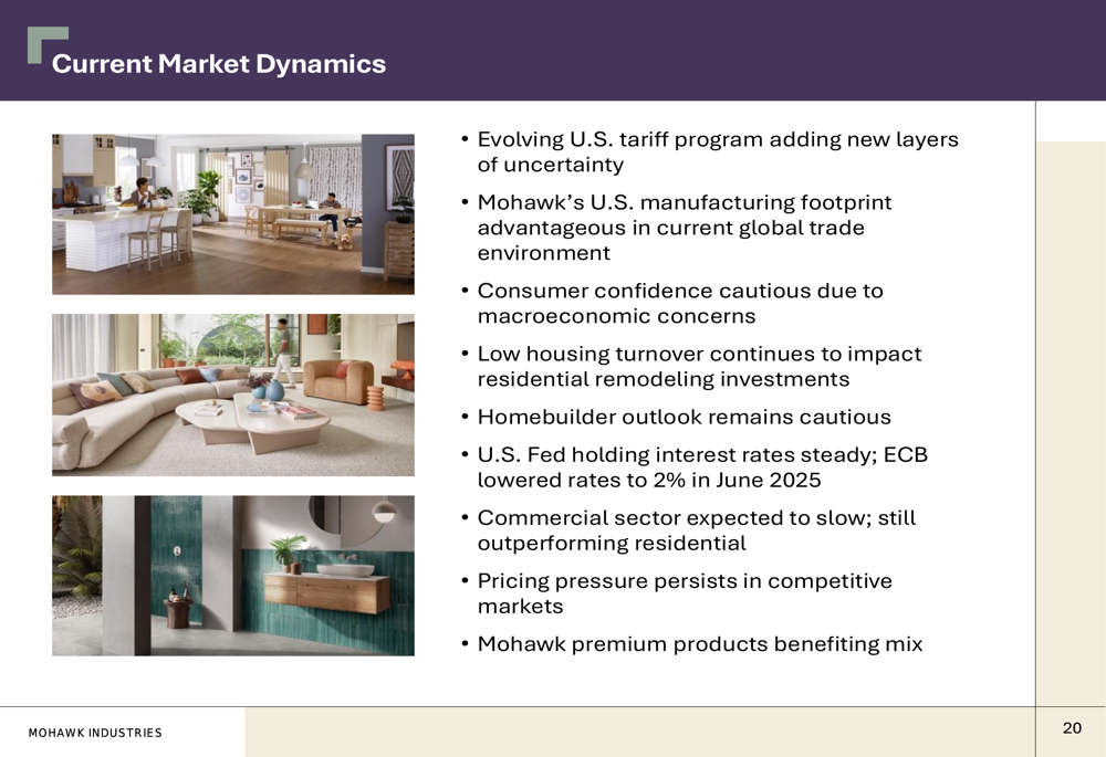 A Mohawk enfrenta vários desafios de mercado, incluindo programas tarifários em evolução nos EUA, confiança cautelosa do consumidor e baixa rotatividade imobiliária. No entanto, a presença de fabricação doméstica nos EUA proporciona vantagens no ambiente comercial atual, enquanto o setor comercial continua a superar os mercados residenciais.