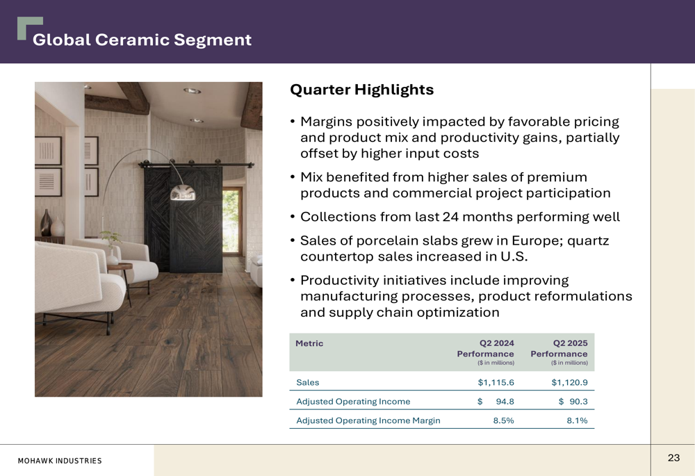 O segmento Global Ceramic registrou um leve aumento nas vendas para US$ 1,12 bilhão, mas experimentou uma queda na margem de 8,5% para 8,1% em comparação ao ano anterior. O segmento se beneficiou de preços favoráveis e mix de produtos, particularmente de maiores vendas de produtos premium e projetos comerciais: