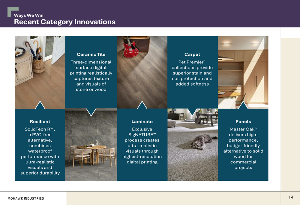 A inovação de produtos continua sendo um diferencial chave para a Mohawk, com inovações recentes de categoria incluindo SolidTech R™ como uma alternativa resiliente livre de PVC, azulejos cerâmicos avançados com impressão digital tridimensional de superfície e coleções especializadas de carpetes: