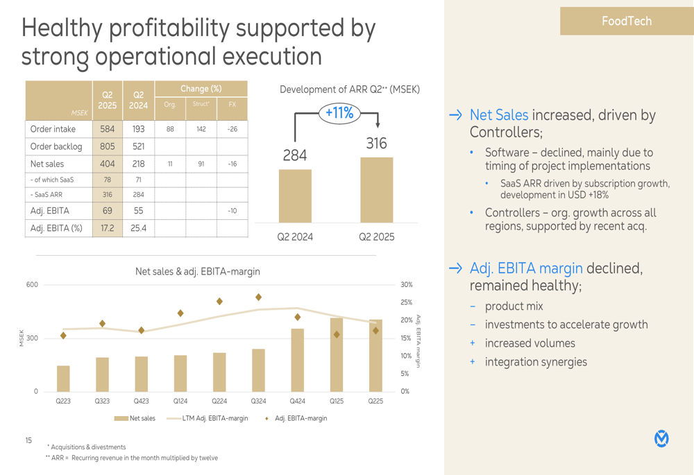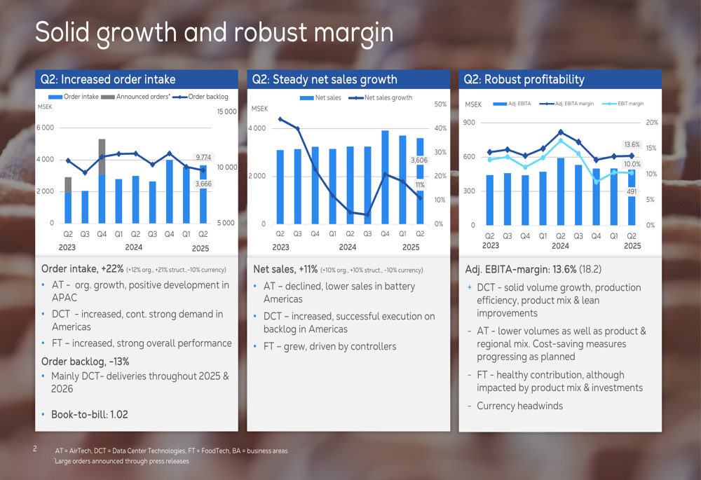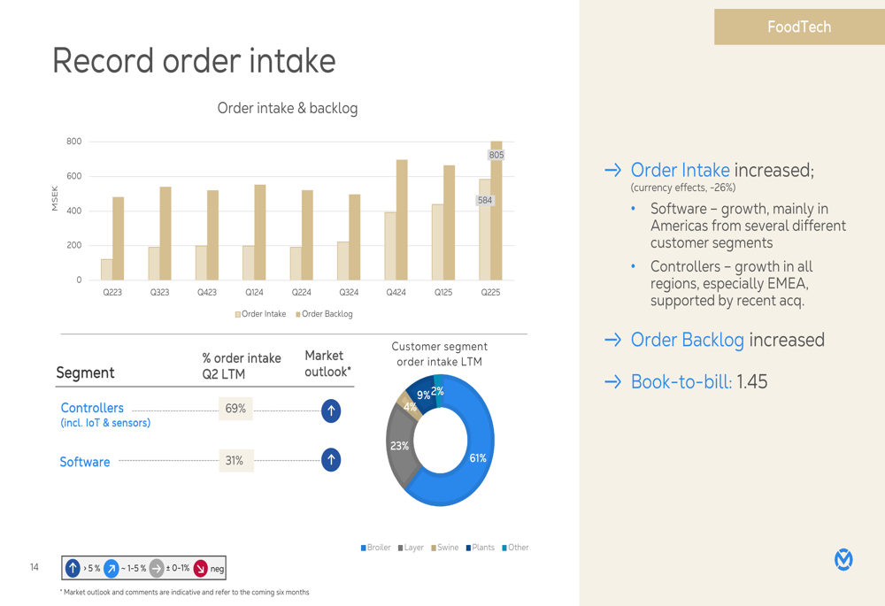 O FoodTech reportou entrada recorde de pedidos no 2º tri de 2025, com crescimento em todas as regiões, particularmente em controladores na EMEA. O segmento alcançou uma relação book-to-bill de 1,45, indicando forte potencial de receita futura. As soluções de software cresceram principalmente nas Américas em diversos segmentos de clientes, enquanto os controladores viram crescimento em todas as regiões, especialmente na EMEA, apoiados por aquisições recentes.