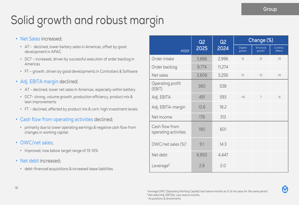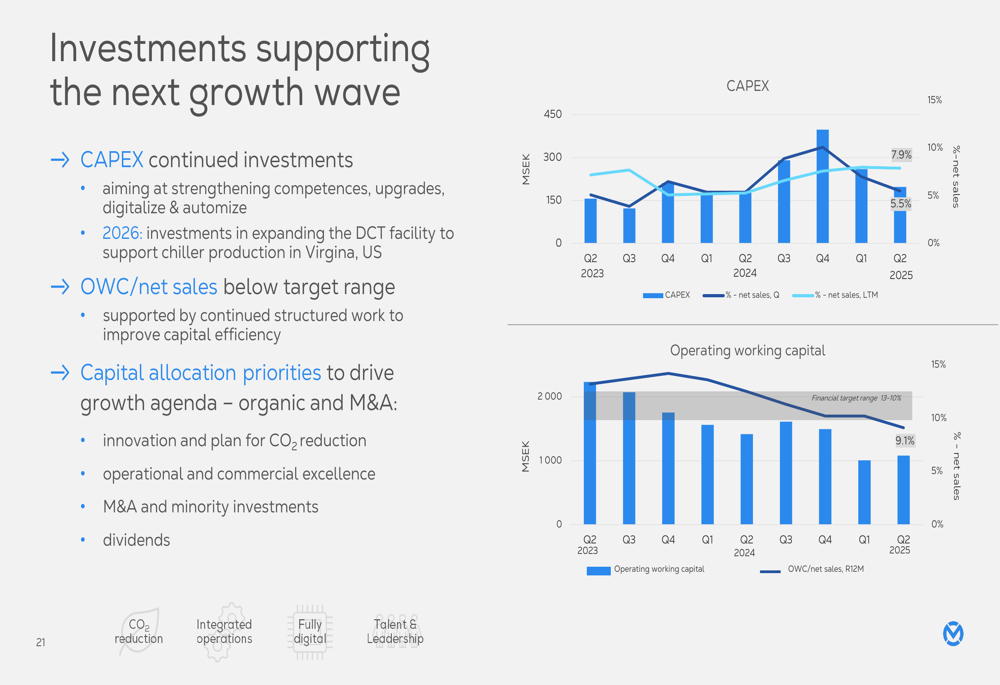 A Munters manteve o foco na gestão de caixa durante o 2º tri de 2025, embora o fluxo de caixa das mudanças no capital de giro tenha diminuído. O índice de alavancagem da empresa ficou em 2,8x, com uma base de financiamento diversificada. As prioridades de alocação de capital continuam a impulsionar a agenda de crescimento, tanto organicamente quanto por meio de atividades de fusões e aquisições.