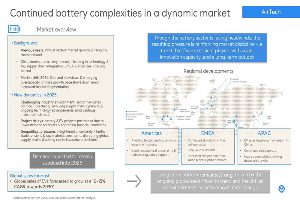 A Munters destacou as complexidades no mercado de baterias, observando que a demanda deve permanecer moderada até 2026, embora as vendas globais de veículos elétricos estejam previstas para crescer a um CAGR de 10-15% até 2030. A empresa está implementando ações para melhorar as margens e enfrentar esses desafios.