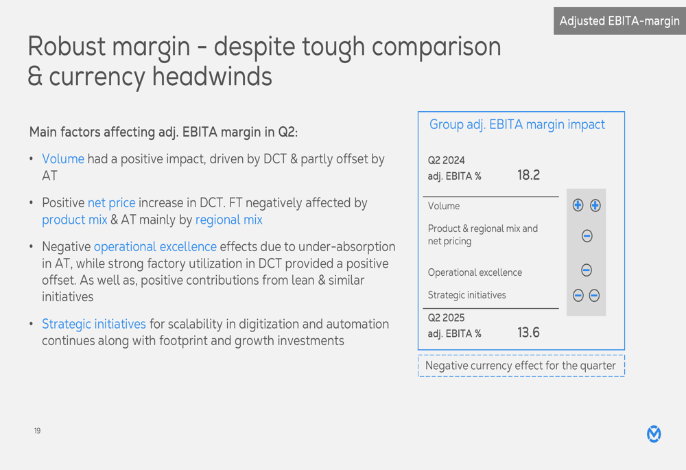 A margem EBITA ajustada para DCT permaneceu forte, apoiada pelo sólido crescimento de volume com alta utilização da produção, mix favorável de produtos e benefícios das iniciativas lean. A empresa também está expandindo sua oferta de chillers para impulsionar o crescimento regional, com a produção de chillers nos EUA programada para começar em 2026.
