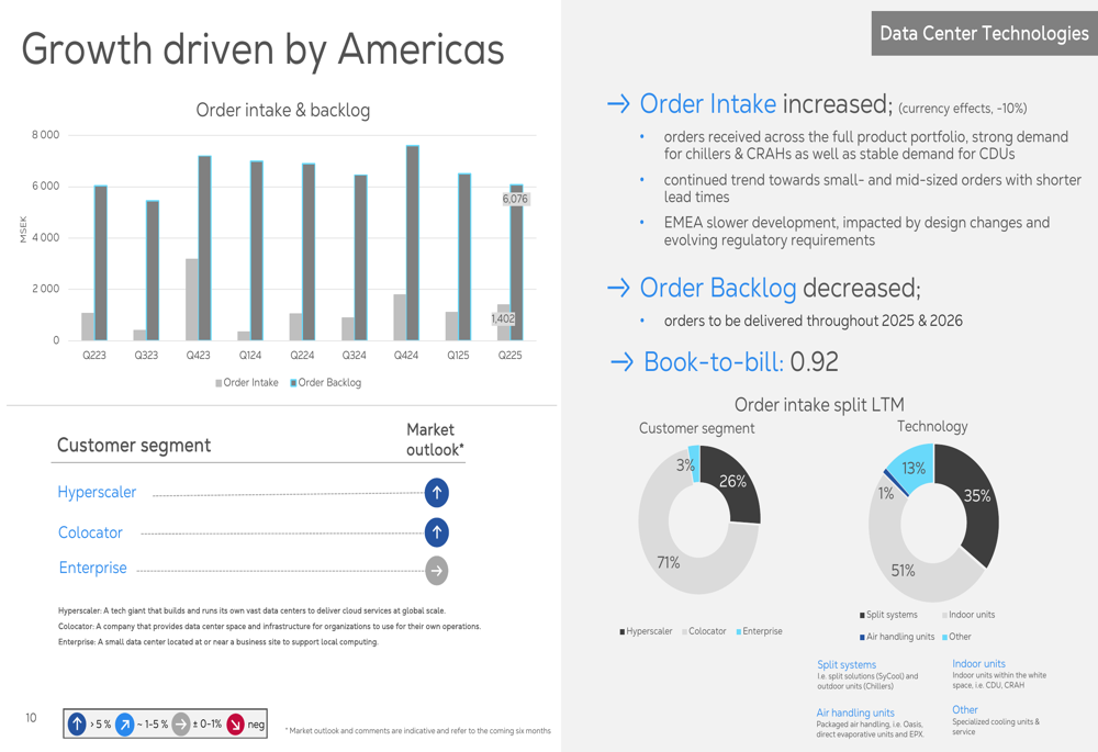 O segmento DCT emergiu como um forte performer no 2º tri de 2025, impulsionado principalmente pela região das Américas. A entrada de pedidos aumentou com encomendas recebidas em todo o portfólio de produtos, com demanda particularmente forte por chillers e CRAHs, além de demanda estável por CDUs. As vendas líquidas aumentaram devido à execução bem-sucedida da carteira de pedidos nas Américas e à demanda por chillers, apoiada pela aquisição da Geoclima.