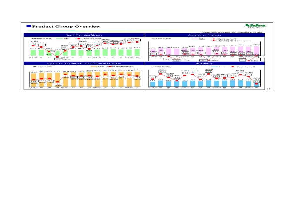 Analisando o desempenho por segmento, a visão geral do grupo de produtos revela resultados mistos entre as unidades de negócios da Nidec: