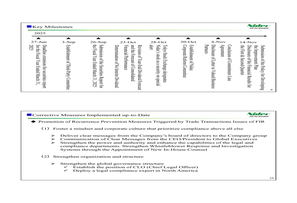 O roteiro inclui cooperação contínua com a investigação do Comitê de Terceiros, implementação de medidas de prevenção de recorrência e, finalmente, a submissão de uma Confirmação Escrita de Gestão Interna à Bolsa de Valores de Tóquio. Se bem-sucedido, esse processo poderia levar à remoção da designação da ação da Nidec como Título sob Alerta Especial até outubro de 2026.