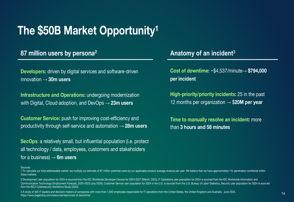 A PagerDuty se posicionou dentro de um mercado total endereçável de US$ 50 bilhões abrangendo desenvolvedores, equipes de infraestrutura e operações, atendimento ao cliente e operações de segurança. A empresa identificou 87 milhões de usuários potenciais nesses segmentos, destacando um espaço significativo para expansão.
