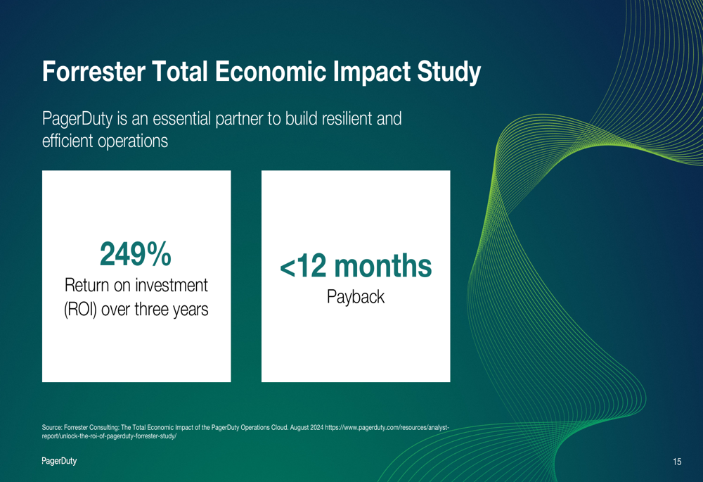 Um estudo de Impacto Econômico Total da Forrester citado na apresentação afirmou um retorno sobre investimento de 249% ao longo de três anos para os clientes da PagerDuty, com retorno em menos de 12 meses: