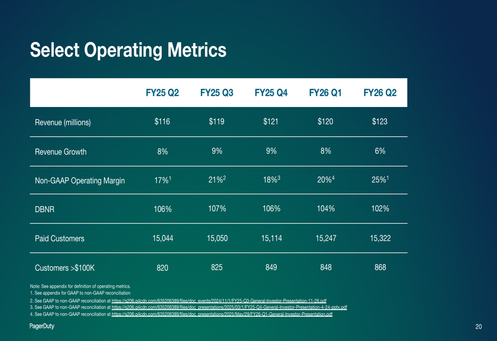 A PagerDuty reportou uma receita de US$ 123 milhões no 2º tri do ano fiscal de 2026, representando um crescimento de 6% em relação ao ano anterior. Embora o crescimento da receita tenha desacelerado em comparação aos 8% reportados no 1º tri do ano fiscal de 2025, a empresa demonstrou forte lucratividade com margem operacional não-GAAP de 25% e margem de fluxo de caixa livre de 24%.