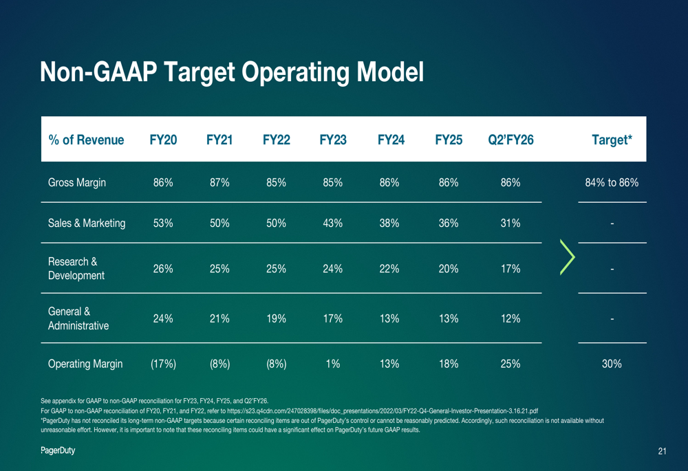 A apresentação delineou o modelo operacional alvo não-GAAP da PagerDuty, mostrando o progresso da empresa em direção às suas metas financeiras de longo prazo. O modelo demonstra melhoria significativa na margem desde o ano fiscal de 2020, com margem operacional do 2º tri do ano fiscal de 2026 de 25% se aproximando da meta da empresa de 28-30%.
