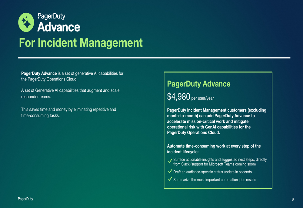 Um foco significativo da apresentação foi o PagerDuty Advance, a oferta de IA generativa da empresa com preço de US$ 4.980 por usuário/ano. Esta solução premium visa automatizar tarefas repetitivas durante todo o ciclo de vida de incidentes, potencialmente aumentando a receita média por usuário.