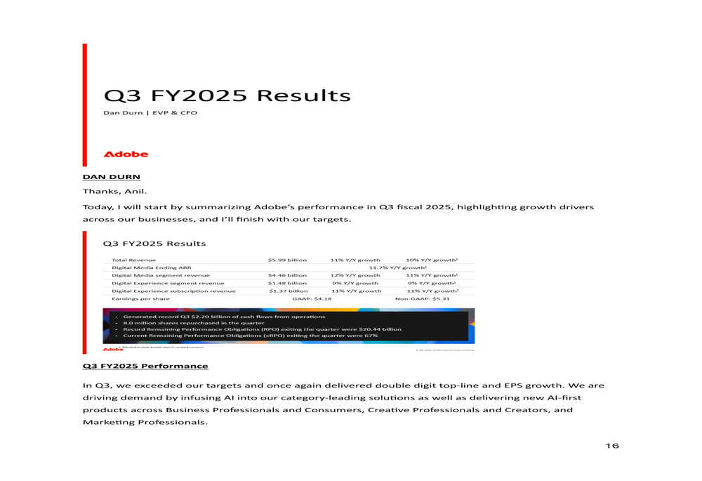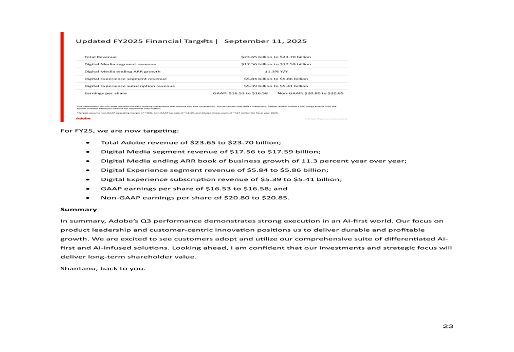 Com crescimento consistente de receita, adoção expandida de IA e metas financeiras elevadas, a apresentação do 3º tri da Adobe indica que a empresa está executando com sucesso sua estratégia de integrar IA em todo seu portfólio de tecnologia criativa e de marketing, mantendo um forte desempenho financeiro.