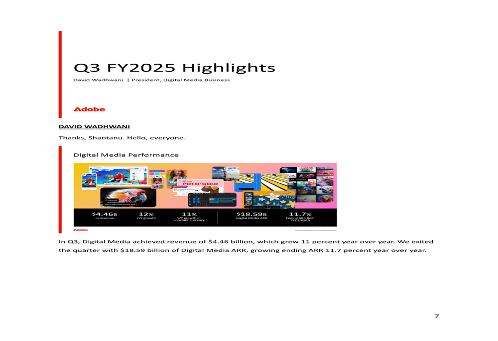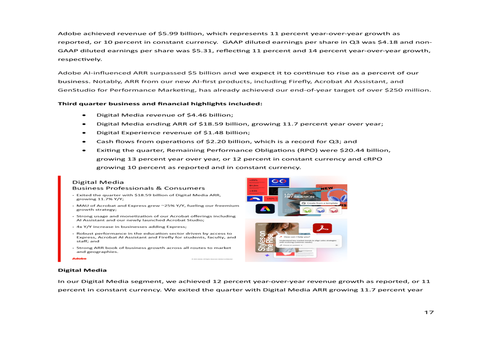 O segmento de Mídia Digital da empresa, que inclui o Creative Cloud e o Document Cloud, gerou receita de US$ 4,46 bilhões, crescendo 12% em relação ao ano anterior (11% em moeda constante). A Receita Recorrente Anual (ARR) de Mídia Digital encerrou o trimestre em US$ 18,59 bilhões, um aumento de 11,7% em relação ao ano anterior.