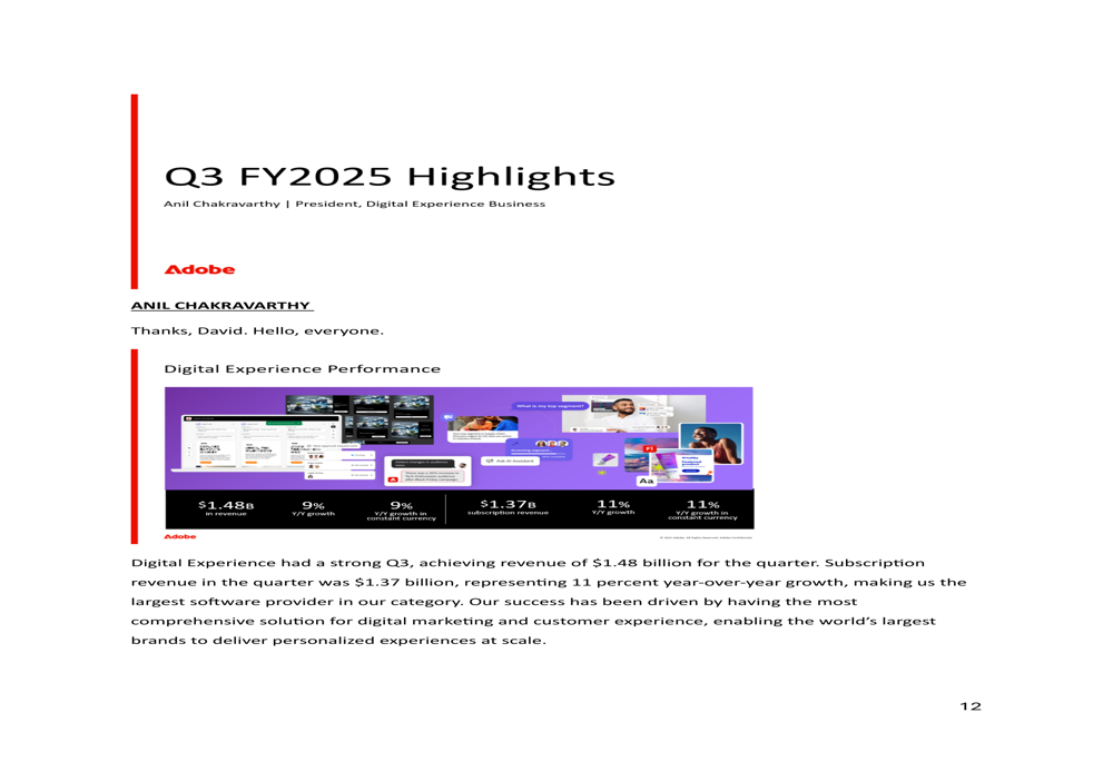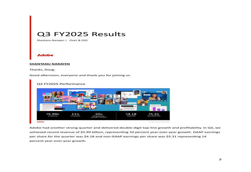 A Adobe reportou receita recorde no 3º tri de US$ 5,99 bilhões, representando um crescimento de 11% em relação ao ano anterior conforme reportado e 10% em moeda constante. O lucro por ação não-GAAP alcançou US$ 5,31, um aumento de 14% em relação ao ano anterior, enquanto o LPA GAAP foi de US$ 4,18.