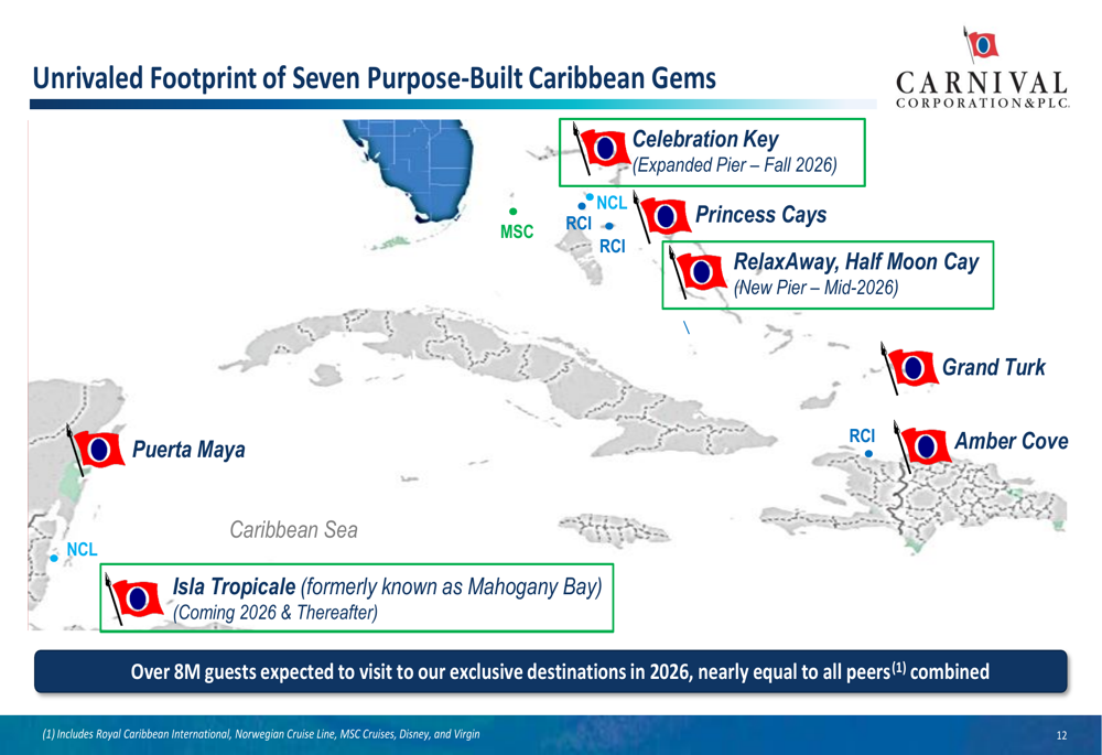 A empresa espera que quase 3 milhões de hóspedes visitem o Celebration Key em 2026, com uma extensão do píer programada para abrir no outono de 2026. Além disso, a Carnival está aprimorando e expandindo o RelaxAway, Half Moon Cay, com um novo píer em construção previsto para abrir em meados de 2026.