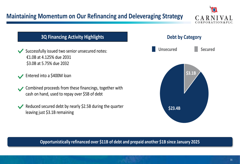 A Carnival fez progressos substanciais no fortalecimento de seu balanço. Durante o trimestre, a empresa emitiu com sucesso duas notas sênior não garantidas (€1,0 bilhão a 4,125% com vencimento em 2031 e US$ 3,0 bilhões a 5,75% com vencimento em 2032) e contratou um empréstimo de US$ 400 milhões. Esses recursos, juntamente com o caixa disponível, foram usados para pagar mais de US$ 5 bilhões em dívidas.